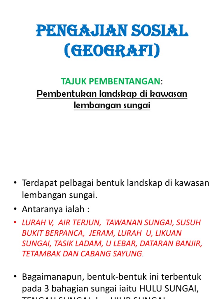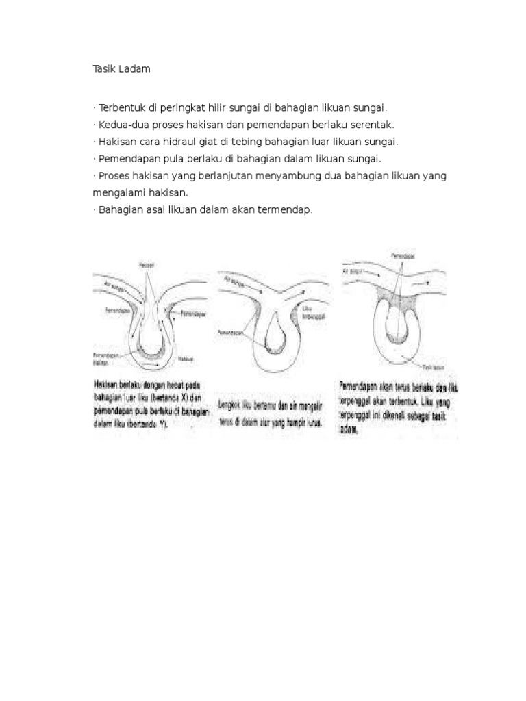 Ke tasik profil sungai hulu tengah hilir lurah v air terjun lubang periuk jeram likuan sungai lurah w dataran mendap tetambak tasik ladam delta aluivium jenis jenis bentuk muka bumi dan potensi kepentingan bentuk muka bumi tanah tinggi cerun bukit sungai tasik potensi kepentingan pelancongan. Kedua dua proses hakisan dan pemendapan berlaku serentak. C jelaskan kesan proses pemendapan sungai terhadap aktiviti manusia. Bahan seperti lumpur pasir kelikir yang.